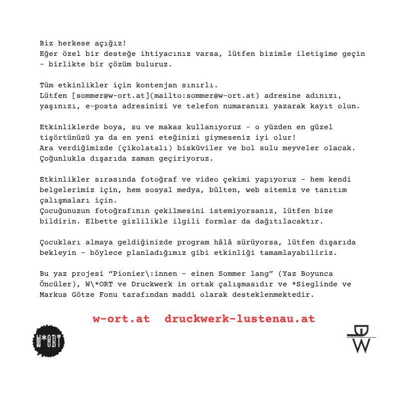 W*ORT yaz programı burada. Bu yıl Druckwerk ile birlikte çalışıyoruz. Ve sanat­çılarla. Çocuklarla, gençlerle ve öğrenmek isteyen her yaştan insanla. Sizinle!
