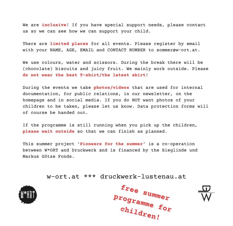 The W*ORT summer programme is here. This year we’re working with Druckwerk. And with artists. With children, young people and people of all ages who are willing to be creative and learn. With you!