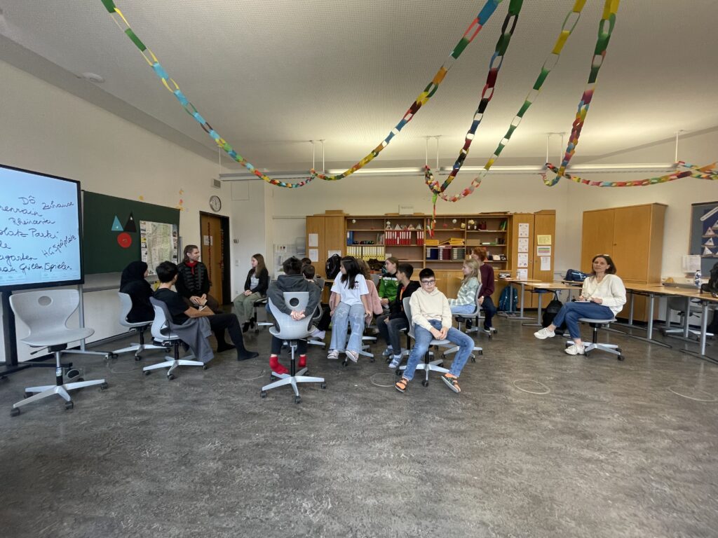 Auch in der ersten von sechs Doppel­stunden wird schon geschrieben. In Klein­gruppen teilen die Schüler:innen ihre Lieblings­plätze und arbeiten an ihrem ersten Schreib­auftrag. Schüler:innen der ersten Gruppe stellen ihre ganz persön­lichen Lieblingsort-Kurzge­schichten vor, die zweite Gruppe erzählt eine impro­vi­sierte Reihum­ge­schichte, während Gruppe drei im Kollektiv geschrieben hat und Gruppe vier uns ein Rätsel in Form eines Kurzge­dichts präsen­tiert. In dieser Gruppe gab es einen Ideen­geber, eine Schrei­berin, eine Leserin – Stärken­einsatz vom besten!